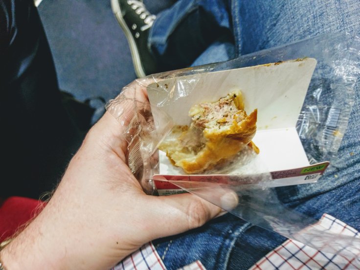 Anyway I buy the sausage roll. On the train the only seats are the flip-down ones on the side next to the toilets. If there was a table and fewer people able to see me I would freestyle this a bit more: a bite of sandwich here, a crisp there. But I’m constrained by the location and have to keep anything I’m not currently eating in the bag on the floor, so I adopt an approach that is at least sequentially faultless: one sandwich, crisps, second sandwich, sausage roll, third sandwich, job done. More strangers have watched me eat than I’d like, but presumably they admired the discipline.