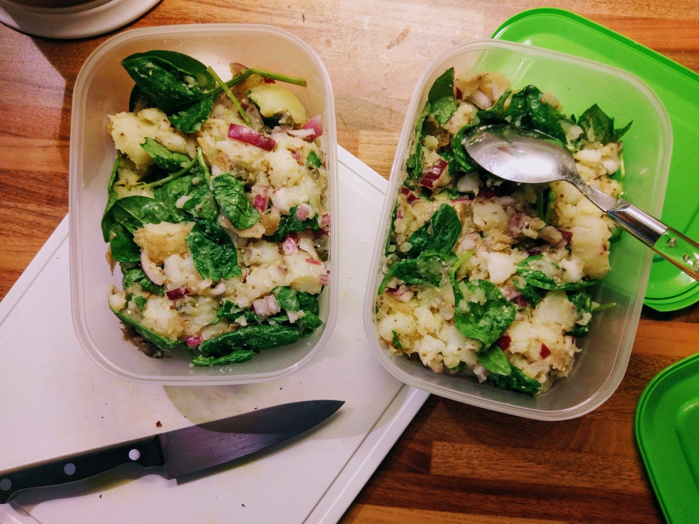 I’m busking a bit now. Spinach I’ve always got in, so I stir some leaves into the drained potatoes and let them wilt a bit, then the red onion and some capers, before dressing it with the stock mix and some seasoning. Throughout all this I’m weighing things and scanning barcodes into MyFitnessPal to work out the calorie content. What you learn very quickly when logging everything you eat and drink into an app is that (a) putting olive oil in anything really screws you over, so you might as well just find other ways of making dressings, and (b) over time, the very act of logging it makes you think more about what you eat and alters your behaviour. It’s like a sort of Panopticon in which you’ve voluntarily locked yourself.