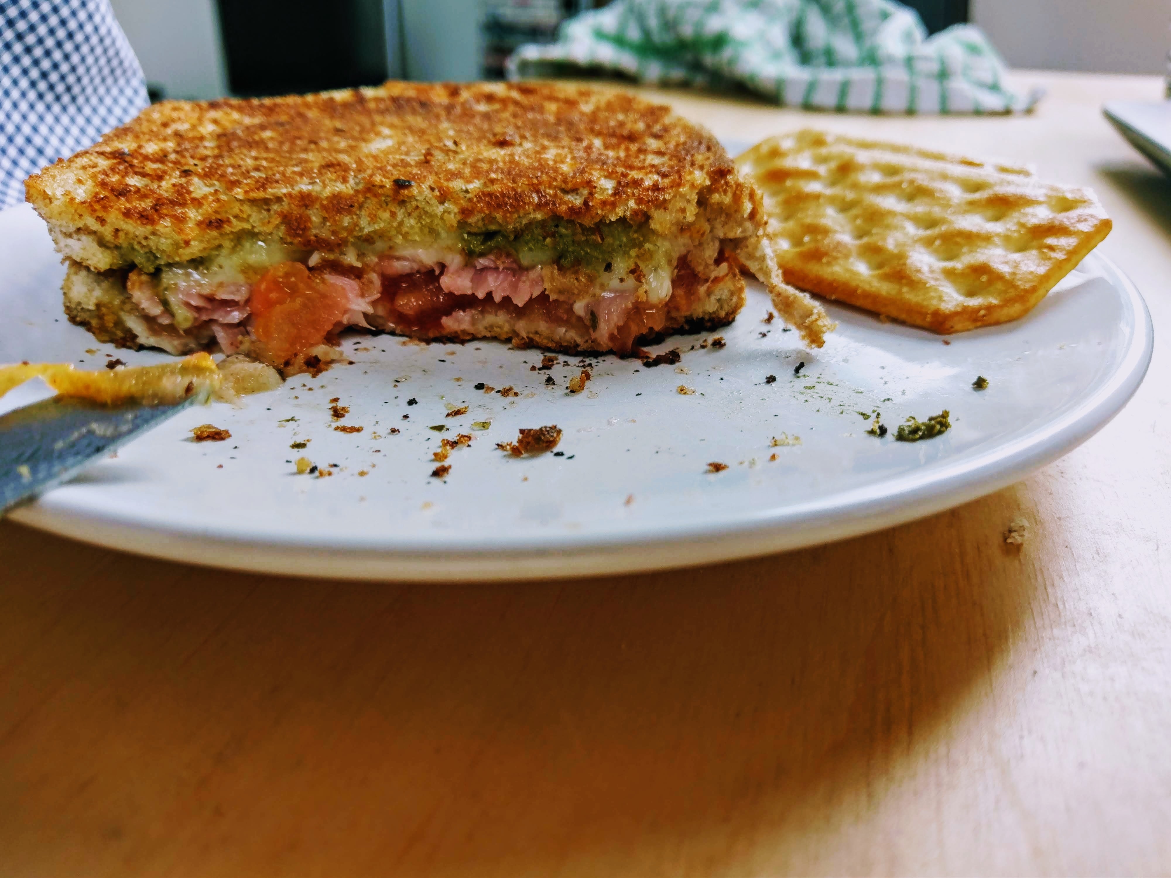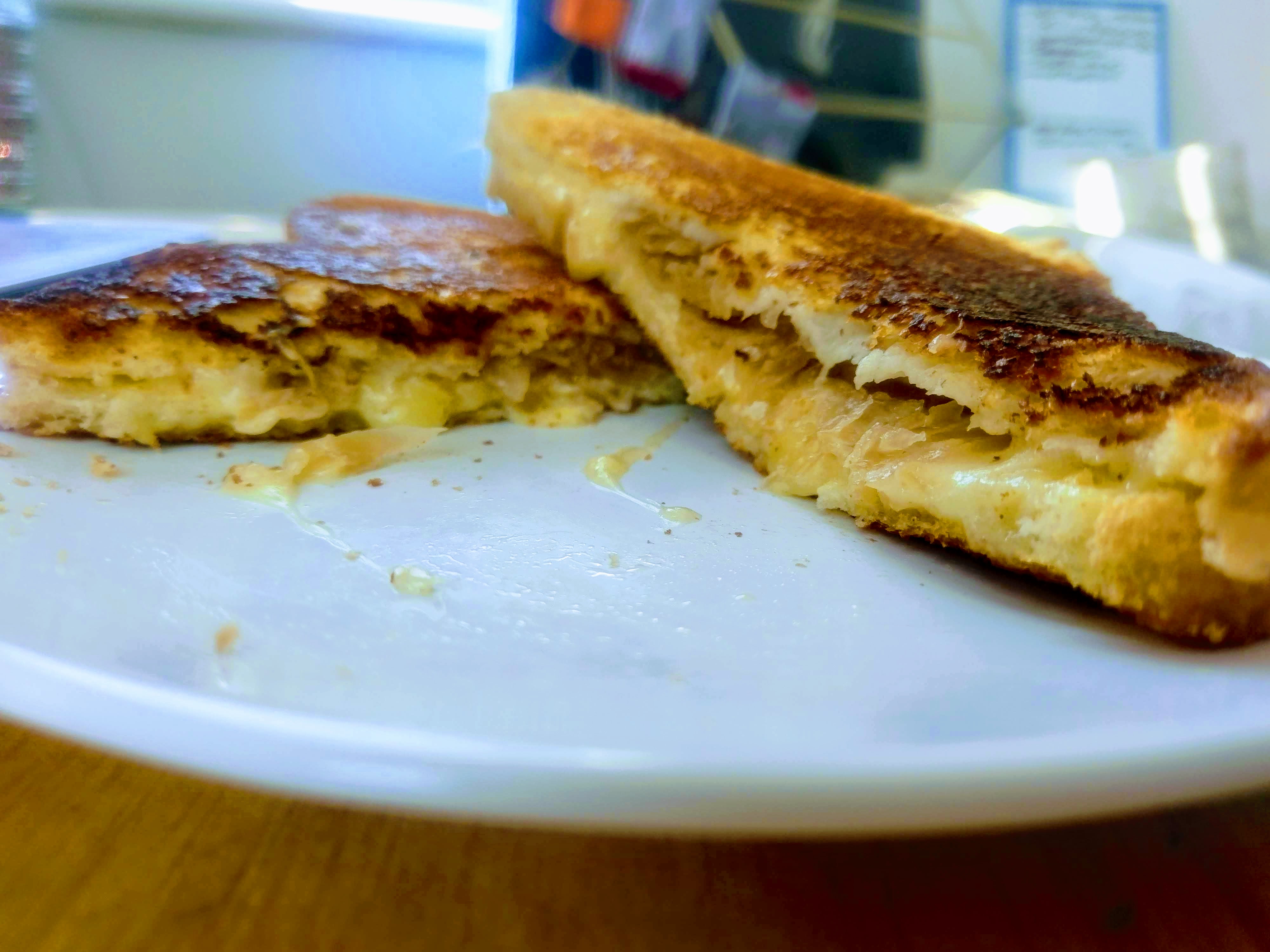 A grilled cheese sandwich, made in a pan with a plate pressing it down, is somehow more satisfying than its edge-sealed Brevill cousin. Within the cheese sandwich arena your panfellows tend towards the traditional items that commonly find themselves cheese adjacent: your hams, your tomatoes, your pestos. The cheese, mustard and sauerkraut variation below on the right is such a bold break with this orthodoxy that it might as well be a picture of Jimi Hendrix setting his guitar on fire.