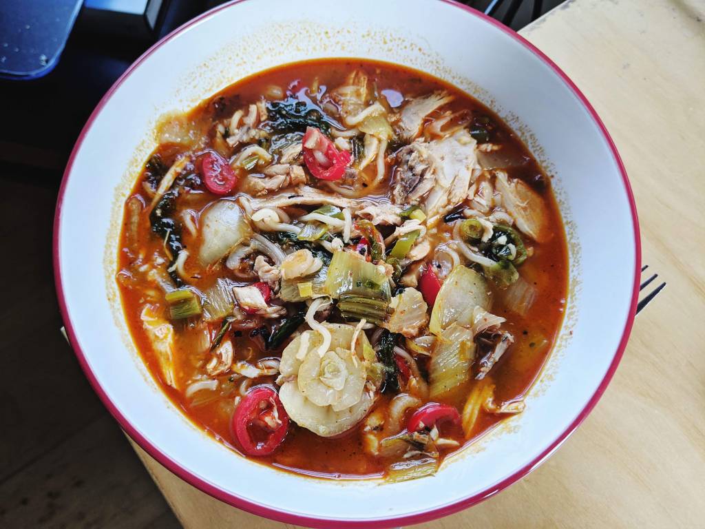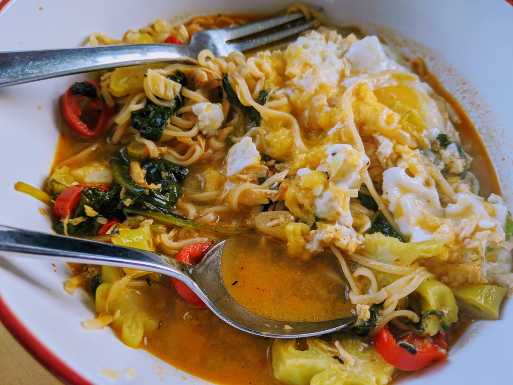 The best of the packets I’ve cracked open so far is the Thai tom saab, a spicy sour pork rib-based broth that I do with some broccoli stalks and spinach. On a whim I crack an egg into it, which doesn’t turn it into a wat tan hor-style egg gravy as I’d vaguely envisaged, but more just a thing that was already delicious but now has an egg poached in it, thus making it more delicious. There are thirteen packets to go but I’ll probably order fifteen more next week just so I can track the noodle van again.