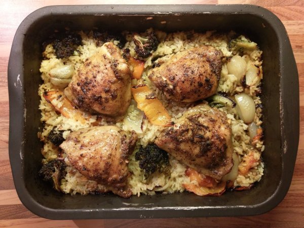 Tray-baked chicken thighs with rice, broccoli and peppers