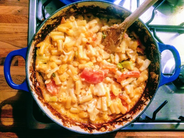 I am eating some chaource cheese on corn thins for lunch when I notice that the rind is a bit blue-tasting for my liking. I hit upon a plan: what if I could throw it all into a saucepan with some other stuff this evening to deaden the flavour and still fulfil my weekend goal of stuffing a lot of cheese into my idiot face? It's not a very intricate plan admittedly but it's worth a bash.
